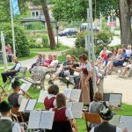 Den Anfang in dieser Stunde machte die große Musikkapelle, die – wie schon in den letzten Wochen – mit viel Abstand unter den Bäumen musizierte. Bürgermeisterin Irene Biebl-Daiber moderierte diesen Abend, der vollständig der bayerisch-böhmischen Blasmusik mit Märschen, Walzern und Polkas galt.