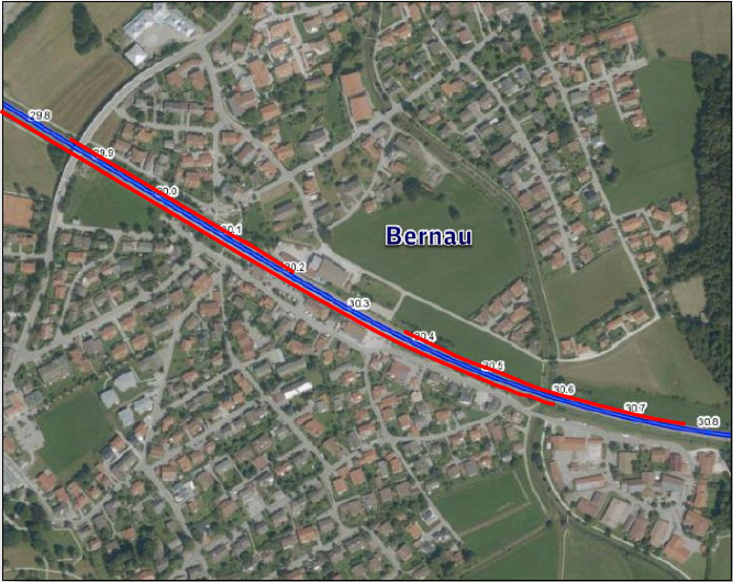 Blau: die Bahnlinie München – Salzburg, in rot: die geplanten Lärmschutzwände Wand 1 Bereich An der Bahn bahnlinks/Nordseite für eine Länge von ca. 370 m Wand 2 Bereich Pankoferstraße bahnrecht/Südseite für eine Länge von 880 m Wand 3 Bereich Irschen bahnlinks/Nordseite für eine Länge von 395 m