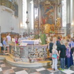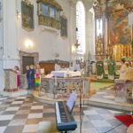 In den Vorbesprechungen des Familienkreises des Priener Pfarrgemeinderates kristallisierten sich zwei wichtige Punkte heraus. Besuch einer sonntäglichen Eucharistiefeier in Verbindung mit geselligem Beisammensein im Anschluss, das war das Ziel. Immer schon gibt es in Prien Wortgottesfeiern für Kinder, ob im Pfarrheim oder im Grünen. Uns erscheint es aber als sehr wichtig, die Kinder auch an die Eucharistiefeier in der Kirche heranzuführen. Die normalen Sonntagsgottesdienste sind meistens etwas länger und somit für kleinere Kinder eine gewisse Herausforderung. Somit sollte der Familiengottesdienst etwas kürzer, aber nicht minder feierlich gestaltet werden. So dauerte der Gottesdienst dann knapp 50 Minuten, trotz Gloria und Weihrauch. Unter Leitung von Bartholomäus Prankl gestaltete der Kinderchor die heilige Messe musikalisch, nach der Kommunionausteilung gab es sogar einen Ortswechsel von der Orgel hinunter zum Marienaltar zur Freude der vielen Gottesdienstbesucher.