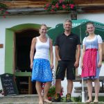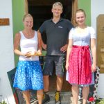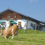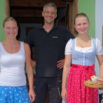 Auf diese Aufgabe, dem Herrichten des Almschmuckes und dem Aufkränzen freuen sich jetzt schon die beiden heurigen jungen Sennerinnen Anna (31 Jahre) und Angela (23 Jahre). Beide verbringen heuer ihren ersten Almsommer in den Bergen abseits der sonst gewohnten Gesellschaft und beide sind froh, den Schritt weg vom bisherigen Arbeitsplatz hinauf auf die Hochalm gewagt zu haben. Anna aus der Gemeinde Saaldorf ist gelernte Schnitt-Zeichnerin und Angela aus Waging ist Gärtnerin. Anna und Angela ließen sich vor ihrem Almbezug von der Almbäuerin Steffi Aigner im Verarbeiten der Milch und im Kasen einlernen, Almbauer Anderl Aigner vermittelte viele Details zum Melken, für den Stall und rund um die Alm. Angela kommt noch zugute, dass sie auf dem kleinen elterlichen Bauernhof den Umgang mit Tieren und mit der Natur von klein auf kennengelernt hat. Wöchentlich wechseln sich die beiden Sennerinnen mit ihren Aufgaben ab. Eine kümmert sich um das Melken der Kühe und um das Käsen, denn die gesamte Milch wird zu Käse verarbeitet. Die Andere sorgt in dieser Zeit für die Brotzeitversorgung der Gäste und für das Backen von Kuchen mit dem Holzofen. Eine ganz wichtige Aufgabe ist das tägliche Zählen des Almviehs, was gar nicht so einfach ist. Einmal verzählten sich beide Sennerinnen, als der Almbauer wegen einer von ihm bemerkten Unruhe selbst zählte, waren anstatt der 43 Tiere nur 42 vorzufinden. Ein Jungrind entkam aus der Weide und verstieg sich an einem ganz schmalen Steig in Richtung Schleching, mit viel Glück wurde das Tier gefunden und wieder zur Herde zurückgebracht. Um 5 Uhr in der Früh beginnt für die Sennerinnen der Almdienst, die ersten Gäste kommen rund fünf Stunden später. „Bis dahin haben wir schon den Sonnenaufgang und das Frühstück genossen“, so die Sennerin Angela und Anna ergänzt: „Hier in den Bergen sind wir weit weg von unten und ganz in der Freiheit und in der Natur“. Für die Gärtnerin und Kräuterpädagogin ist besonders die Vielfalt der Blumen, Gräser und Kräuter sehr interessant, denn die Arten dessen, was auf den Weiden wächst, ist zwischen Kampenwand und Hochplatte oftmals ganz unterschiedlich. Am meisten bestellt wird von den Gästen, der Alm-Brotzeitteller, darauf befindet sich nicht nur der eigene Almkäse in verschiedenen Variationen, sondern auch der Alm-Speck und die von einem Metzger hergestellte Salami vom eigenen Almrindfleisch. Hilfreich ist es da, dass auf der Hochalm vier Ferkel bis zur Schlachtreife gefüttert werden. Die Familie Aigner vermarktet im übrigen ganzjährig das Almrindfleisch ab Hof, dazu heißt es: „Frische Luft, würzige Almwiesen, ständige Bewegung und die hervorragenden Eigenschaften der Fleischrasse Fleckvieh ergeben den einzigartigen Geschmack und die Qualität unseres Fleisches“. Bei den Getränken gibt es unter anderem Biere der Brauerein Schönram, was darauf zurückzuführen ist, dass einmal ein Senner zehn Jahre lang Sommer-Dienst auf der Hochalm leistete und im Winter bei der Brauerei arbeitete. Seither besteht eine gegenseitige und zufriedenstellende Partnerschaft.