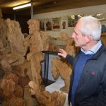 Inmitten seiner expressiven Skulpturen erzählte der 65- jährige den interessierten Zuhörern aus seiner Lebensgeschichte. Nach der Schulzeit und Tischlerlehre, wobei er vor – und nachher bei der Stallarbeit helfen musste, begann er seine weitere Laufbahn beim damaligen Bundesgrenzschutz. Er wurde unter anderem bei der RAF – Fahndung, sowie bei der Großdemonstration in Brockdorf eingesetzt. 1981 schied er aus dem Polizeidienst aus, übernahm die Landwirtschaft seiner Tante und arbeitete im Nebenerwerb in einem Schreinerbetrieb. Hier erkannte er die Kunst für sich. Seit 1983 ist er als freischaffender Bildhauer tätig. Bis heute hatte er über 200 Einzelausstellungen in 16 Ländern und mehr als hundert Ausstellungsbeteiligungen im In- und Ausland. Außerdem hat er eine Gastprofessur in Luoyang (China) inne.