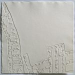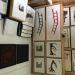 Zuerst führt mich Gudrun, deren Arbeitsschwerpunkt auf der Radierung und dem Prägedruck liegt, in ihr Atelier im Parterre. Ihr grafisches Werk ist diszipliniert, streng und klar, ihre Bildsprache baut sich formal und inhaltlich aus dem Spannungsfeld von Gegensätzen auf. Wesentliche Gestaltungsmerkmale sind dabei der Kontrast von Hell und Dunkel und das Aufeinandertreffen verschiedenstofflicher Oberflächen. Inspiriert wird die äüßerst fantasiereiche Künstlerin von Alltagsdingen, so z.B. vom Punktemuster der Brailleschrift. Bei der sehr aufwendigen Technik sticht sie die Blindenschrift von der Rückseite aus in das Papier, wodurch ein Relief erhabener und vertiefter Strukturelemente entsteht. Auch ins ästhetisch schwierige und ethisch komplexe Reich der Objektkunst wagt sich die Künstlerin. Mit ihrem brisanten Werkzyklus “Gärtnerspiele im Menschenpark” widmet sie sich dem Thema des reproduzierbaren Menschen, der Manipulation des Lebens und aller damit zusammenhängerder Fragestellungen. Die Arbeiten der Künstlerin vermitteln Botschaften und eröffnen Erfahrungsräume, die den Betrachter allerdings schon fordern. Man braucht bei Gudruns Bildern und Druckgrafiken etwas Zeit, bis sich Zeichen und Formen im Wechselspiel von Licht und Schatten erschließen. Die Kunsthistorikerin Judith Bader beschreibt Gudruns Arbeiten so: