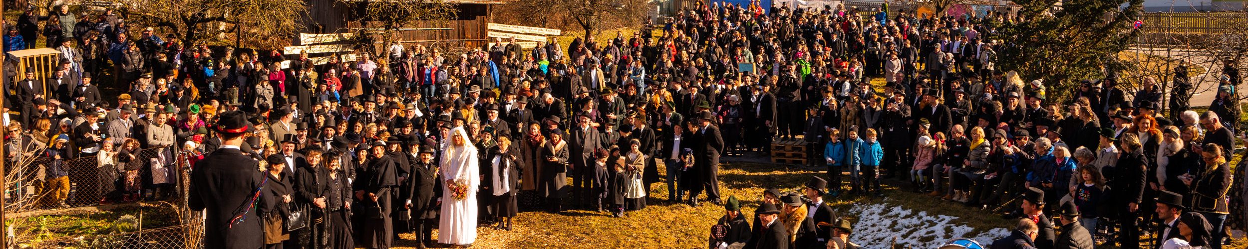 Ganz Söllhuben war auf den Beinen, als der örtliche Trachtenverein “D´Hochlandler” zur heurigen Bettelhochzeit einlud. Lisbert Vollinger und Odlgundis Furzner sagten sich zwar auf dem Misthaufen das “Ja-Wort” und schworen “ewige Treue” – doch schon die Hindernisse und Eskapaden bei Tageslicht ließen schon befürchten, dass die Ehe nicht bis zum Anbruch des nächsten Tageslichtes halten wird. Die „Braut“ ist ziemlich groß und maskulin, der Bräutigam wesentlich kleiner. Schönheit ist keine Bedingung für eine Bettelhochzeit. Auf dem Misthaufen werden die beiden bis zum Aschermittwoch „verheiratet“. Ein Hochzeitszug mit geschmückten Wagen führte durch Söllhuben zum Standesamt. Es war ein stattlicher Hochzeitszug mit Hochzeitskutsche, Kammertwagen mit der Mitgift der Braut sowie der ganzen narrischen Hochzeitsgesellschaft und einigen Hundert Zuschauern. Die Garderobe für die Hochzeitsgesellschaft auch heute dem Anlaß gemäß sehr festlich „schwarz/weiß.“ Hochzeitslader war Simandl Gscheidmayer, der Grattler von Parnsberg. Eines ist sicher: der Trachtenverein, die Wildenwarter und Söllhubener Musikanten, die Progoder, die Ehrleute, die Hochzeitsleute und alle, die im Wege oder am Wegrand standen, sie alle hatten eine Menge Gaudi. So fand ein Faschingstreiben statt, bei dem die Gäste nach der Hochzeit noch ausgelassen auf das Brautpaar anstoßen können, gemäß dem Motto „Vivat das elende Brautpaar!“ Natürlich fand auch noch ein „Jungfrauenlauf“ statt. Von dieser Freude mögen diese Bilder von der Söllhubener Bettelhochzeit zeugen.