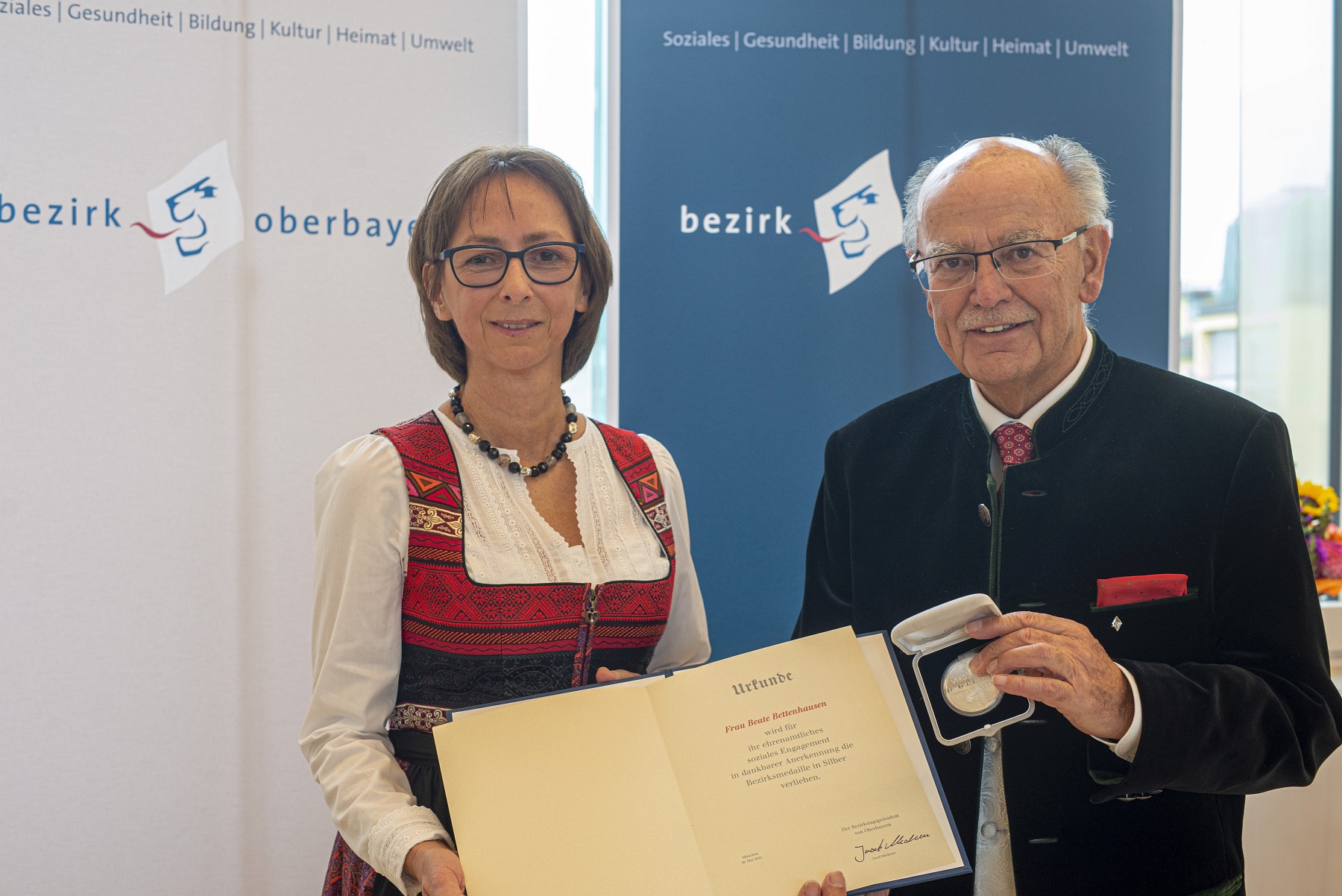 Verleihung der Bezirksmedaille am 29.9.2022 in München: Bezirkstagspräsident Josef mederer (rechts) überreichte die Ehrung an Beate Bettenhausen.
