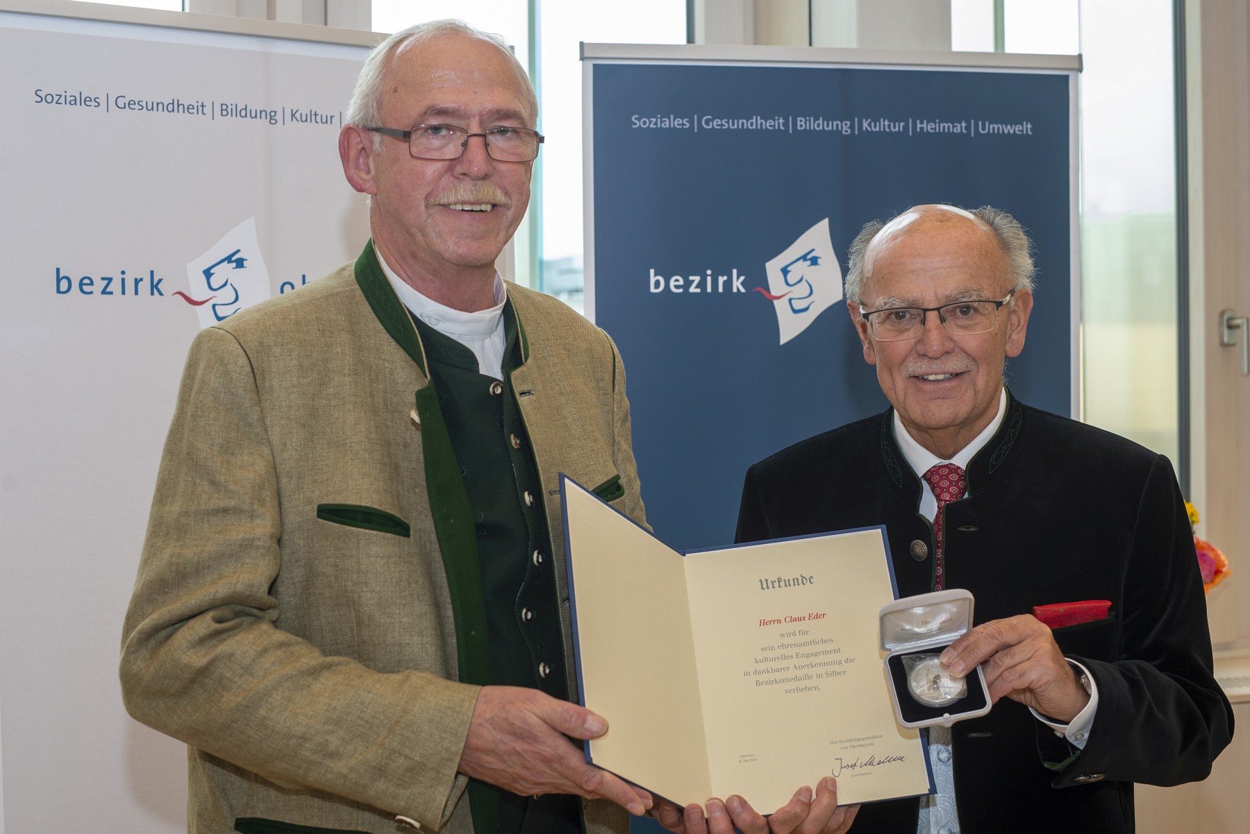 Verleihung der Bezirksmedaille am 29.9.2022 in München. Bezirkstagspräsident Josef Mederer (rechts) überreicht die Auszeichnung an Claus Eder.