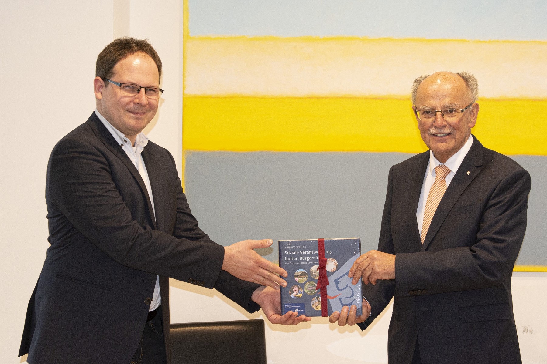 Zum Einstand erhielt Hannes Beims (links) von Bezirkstagspräsident Josef Mederer die Bezirkschronik.