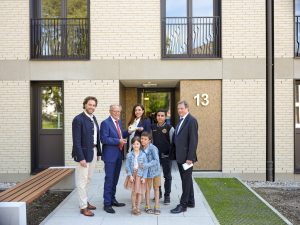 Große Freude über das neue Zuhause: Bezirkstagspräsident Josef Mederer (2. v. links) bei der Schlüsselübergabe an die erste Mieterin der Neubauten an der Apfelwiese. Die Sachbearbeiterin beim Bezirk, Marja Santana Glanz, bezieht im Jugendstilpark mit ihren drei Kindern eine Vier-Zimmer-Familienwohnung. Ganz links: Haars Bürgermeister Andreas Bukowski, rechts: OH-Geschäftsführer Michael Zaigler. Foto: Oberbayerische Heimstätte | Reiner Pohl