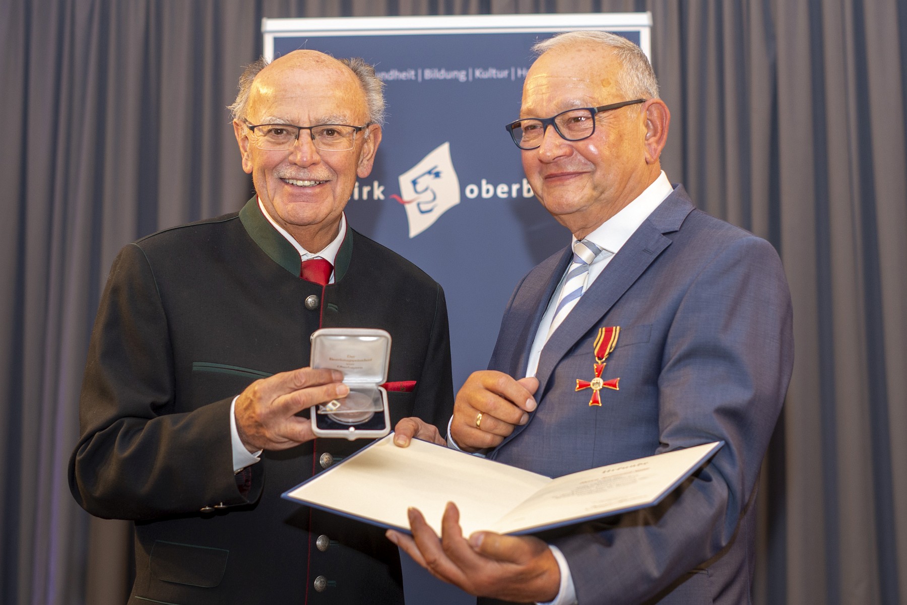 Bezirkstagspräsident Josef Mederer (links) verleiht die Bezirksmedaille an Raimund Said.