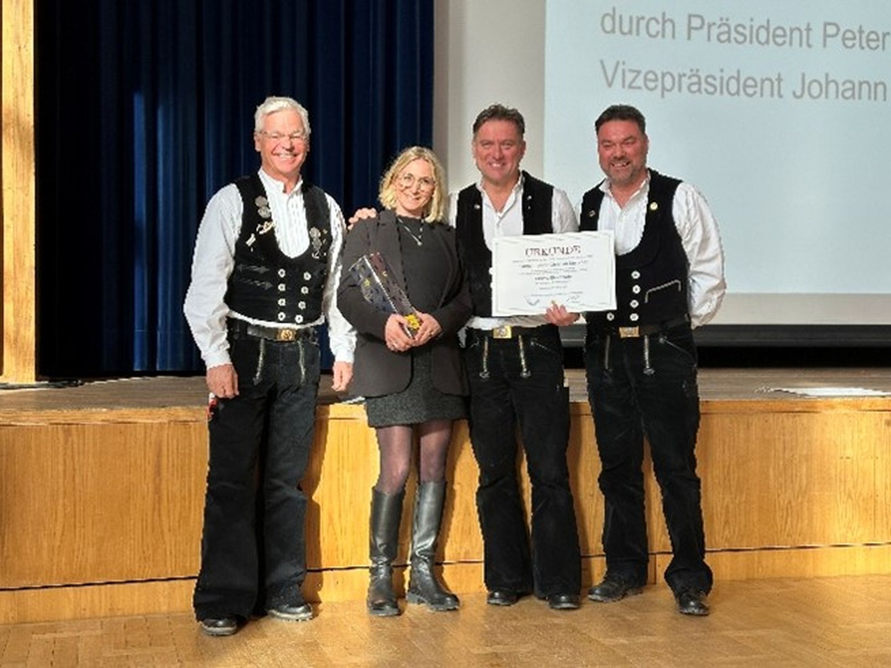 Für seine ehrenamtliche Arbeit und seine besonderen Verdienste wurde Obermeister Christian Stemmer mit der Silbernen Ehrennadel des Bayerischen Zimmererhandwerks ausgezeichnet. V.l.n.r.: Präsident LIV Peter Aicher, Nicole Stemmer, Obermeister der Zimmerer-Innung Neuburg/Schrobenhausen Christian Stemmer und 2. Vizepräsident LIV Johann Schlemmer. Quelle: LIV
