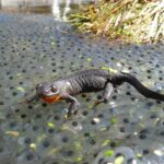 Auf den letzten Metern in sein Laichgewässer wandert dieser Bergmolch über den Laich von Grasfröschen (Foto: Mag. Martin Kyek, Bayerisch Gmain).