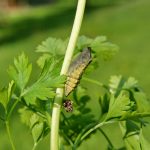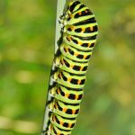 Bild 1: Schwalbenschwanz, Raupe: Die auffällig bunte, bis zu 5cm lange Raupe des Schwalbenschwanzes frisst an Doldenblütlern wie Fenchel, Möhre, Dill, etc.