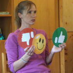 Wagner hat die Vision, dass Kinder es lernen können, die vielfältigen Herausforderungen des Lebens gut zu bewältigen und gestärkt daraus hervorzugehen. Den Grundoptimismus könne man trainieren wie einen Muskel, ist sie überzeugt. Dazu hat sie verschiedene Spielsachen mitgebracht, um die Kinder dort abzuholen, wo sie sich wohlfühlen: einen Zauberstab, eine Krone, die man richten und weitermachen kann, auch wenn man hingefallen ist. Mit Hilfe von Bildkarten mit Daumen nach oben oder nach unten erklärte Lisa Wagner den Kindern, dass sie entscheiden können, ob sie sich ärgern wollen oder nicht. Zumindest können sie sich fragen, was sie tun können, damit es ihnen wieder gut geht. Mutmacherkarten sollten den Kindern positive Handlungsmöglichkeiten und Denkmuster aufzeigen. Ein Atemball half beim bewussten Atmen, um Wut und Aufregung einzudämmen. Den zauberhaften Klang eines Glockenspiels durfte jedes Kind einzeln genießen. Sogar eine Fantasiereise an einen Ort, wo sie besonders glücklich waren, durften die Kinder machen. Bewusst angenehme Gefühle wahrzunehmen und sie im Körper zu speichern – das war möglicherweise auch für die anwesenden Mamas ein hilfreicher Vorschlag.