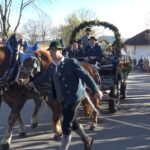 Dem Leonhardiritt in Greimharting geht traditionell ein feierlicher Gottesdienst mit dem örtlichen Kirchenchor voraus. In seiner Predigt erinnerte Pfarrer Philipp Werner an den Heiligen Leonhard. „Der Heilige Leonhard ist gerade mit seinen Attributen Gefangenschaft und Ketten ein Sinnbild auch in heutiger Zeit, wenn wir bedenken, dass wir uns von Egoismus, Sucht oder unguten Gewohnheiten befreien wollen“. Die Heiligen-Verehrung setzte sich dann auch beim segensreichen Umritt fort, unter anderem waren bei den zuweilen vierspännig gezogenen Motivwägen der Heilige Florian, der Heilige Ambrosius oder der Heilige Isidor zu sehen. Auch Kirchen-Modelle ergänzten das Gesamtbild der Frömmigkeit. Mitglieder der Rosserergemeinschaften, unter anderem von Breibrunn, Pietzenkirchen, Prien und Leonhardspfunzen verdeutlichten die gemeinsame Verehrung des Heiligen Leonhard und den hohen Wert der bäuerlichen Brauchtumspflege. Priener Blasmusikanten, Rimstimger und Greimhartinger Kindergartenkinder sowie Röckefrauen des Trachtenvereins „Ratzingerhöhe“ waren heuer ebenso mit dabei wie Ponys mit Kindern und Familien. Mit dem Umritt-Ende war der Festtag für die Greimhartinger in gewohnter Tradition noch lange nicht vorbei. Aufgrund des guten Wetters wurden die Ehrengäste, Rosserer und Besucher nicht nur in der voll besetzten Gemeindehalle von Priener Blasmusikanten unterhalten, auch im Freien ließ es sich gesellig und gut aushalten. Für die passende Bewirtung sorgten die Greimhartinger Frauen mit Kaffee und Kuchen sowie die Feuerwehr und Mitglieder der Ortsvereine für Brotzeit und Bier. Für Rimstings Bürgermeister Andreas Fenzl, der beim Umritt zusammen mit Priens Bürgermeister Andreas Friedrich, mit Bernaus Bürgermeisterin Irene Biebl-Daiber und mit der stellvertretenden Bürgermeisterin von Frasdorf Gabriele Stein auf der Ehrenkutsche von Sebastian Mayer (Fürstnerhof) Platz genommen hatte, war es das letzte Mal als Bürgermeister und Gastgeber, sein Resümee lautete: „Der heurige Leonhardiritt bot alles, was das Herz begehrte: Glauben, Tradition, Heimatliebe und Freude am Zusammenkommen“. Bürgermeister Andreas Fenzl und seine Amtskollegen aus Bernau, Frasdorf und Prien begannen in guter Tradition den Festtag mit dem Einzug in die Kirche und mit der Spende einer Wallfahrtskerze.