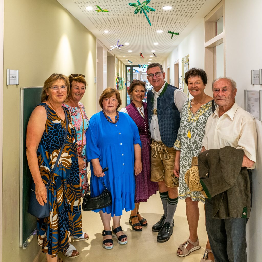 Auf Besichtigungstour des Kindergartens: Von li nach rechts: Annelies Weyerer (frühere Gemeinderätin), Christine Eckert (3. Bürgermeisterin des Samerbergs), Anna Stuffer (Sie hat das Logo des Kindergartens entworfen), Claudia Huber (Ehefrau des Bürgermeisters), Bürgermeister Georg Huber, Elisabeth Kronsteiner und Anton Hollerauer (beide waren früher Schulleiter).