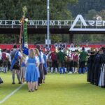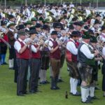 Am Festplatz angekommen wurde zunächst die Labstation (Verpflegung mit Kaiserbier und Fleischkässemmeln) hinter der Haupttribüne am Kuchler Fußballstadion, direkt an der Salzach, aufgesucht. Nachdem hier nach und nach alle Gastkapellen, aus ganz Österreich und aus Bayern, eingetroffen waren, begann die Aufstellung zum Festakt. Registerweise nahmen die rund 500 Musikanten vor der Tribüne Aufstellung – nach der Ansprache des Bürgermeisters, wurde der Kommandant des Schützenkorps Kuchl, eine Traditionsformation in Kaiserjäger-Adjustierung, beauftragt, den Vereinsobmann den Festakt beginnen zu lassen. Bestätigend erwiderte dieser “Jawoll, mit dem Festakt beginnen!“ – zackig ging es dann, für uns ungewohnt, weiter: 500 Musikantinnen und Musikanten wurden mit “das Ganze, hab Acht” in Stellung gerufen – “das Ganze ruht” beendete den militärisch-angehauchten Teil und der Kuchler Kapellmeister leitete das Gesamtspiel ein. Speziell arrangierte Kirchenstücke, gespielt von einem riesigen Orchester, sorgten für Gänsehautstimmung. Nachdem der Ortspfarrer den kurzweiligen Wortgottesdienst beendet hatte, erklang noch der Schönfeld-Marsch von Carl Zierer, damaliger Kapellmeister der Hoch- und Deutschmeister.