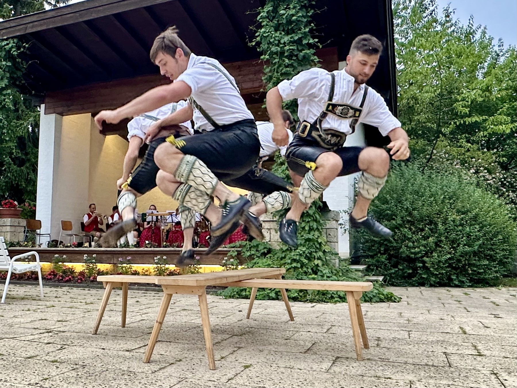 Die Aktiven vom Trachtenverein „Edelweiß“ Niederaschau beim Bankerltanz im Kurpark von Aschau