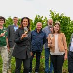 Fotos: Judith Schmidhuber / StMELF – Das erste Bild zeigt Ministerin Michaela Kaniber mit der Fränkischen Weinkönigin Carolin Meyer und Blauen Silvanertrauben. Das zweite Bild zeigt (v.l.): Petra Steinmann-Gronau von der Rebschule Steinmann, Georg Bätz, Leiter des Instituts für Weinbau und Oenologie der LWG, Ministerin Michaela Kaniber, Dr. Horst Kolesch, externer Berater und Ex-LWG-Präsident, Gerd Sych, Sprecher des Slow-Food-Conviviums Hohenlohe-Mainfranken, Weinkönigin Carolin Meyer und Artur Steinmann, Präsident des Fränkischen Weinbauverbands.