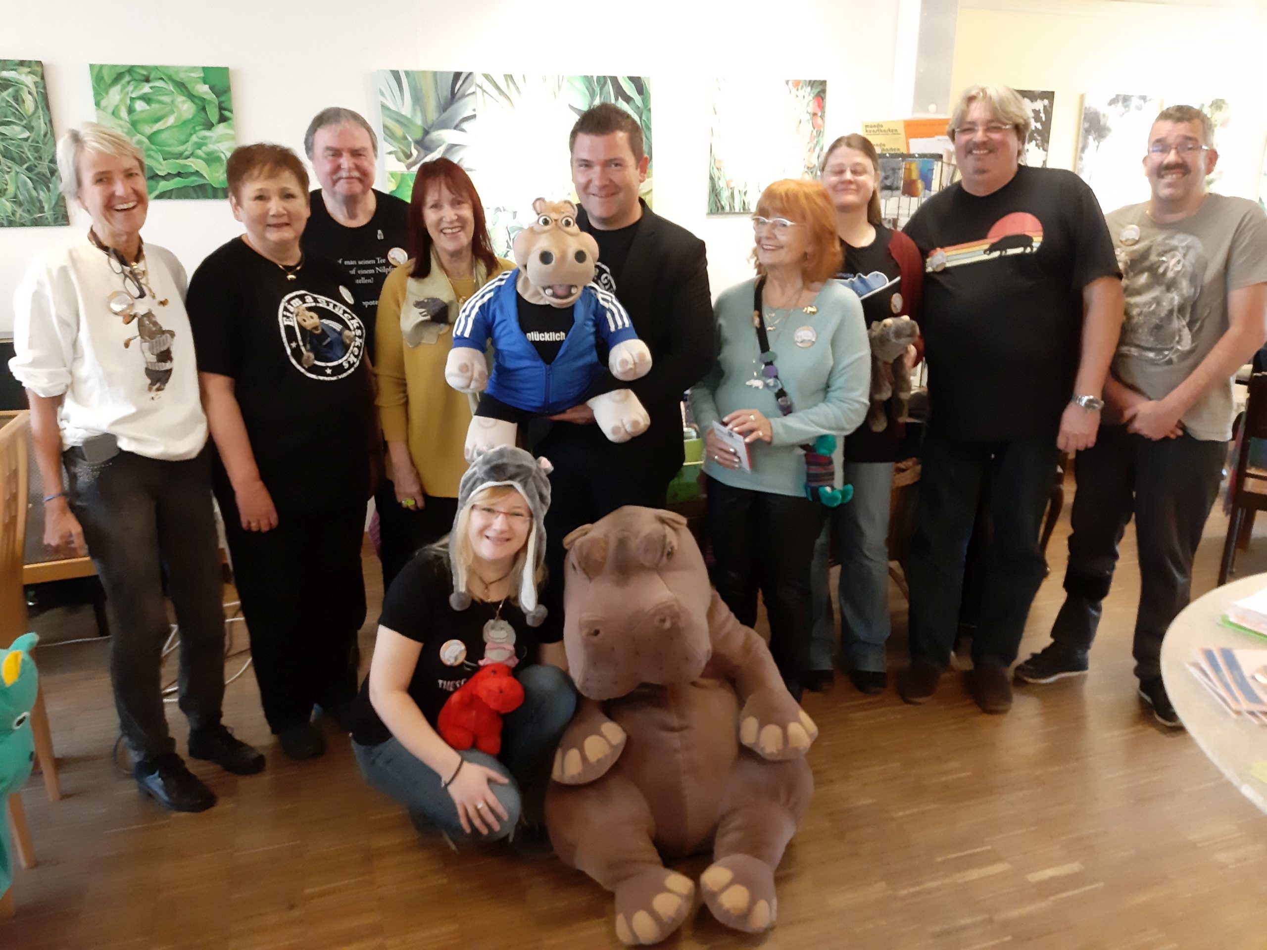 Selbastian Reich (Mitte) mit Nilpferd Amanda, Irmi Mertl (links daneben) und die “Nilpferdfreunde”.