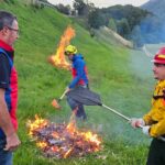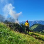 Die Almbauern kamen auf die Sulzing Alm zum Schwenden, also zum Entbuschen der Weideflächen. Schließlich sollen die Almflächen erhalten bleiben – wohin aber mit dem gerodeten Material? Seit altersher werden Äste, Zweige und Gestrüpp zu großen Haufen zusammengetragen und auf freiem Feld angezündet. Unter Aufsicht verbrennen diese Daxenhaufen und am Abend zeugt nur noch eine schwarze Stelle auf der Alm von dem Feuer tagsüber. Pronto führte den Almleuten vor, wie man eine solche Feuerstelle vorbereiten kann, wie ein Überspringen der Flammen auf den Almboden mit einfachen Maßnahmen verhindert werden kann und damit die Entstehung eines Flächen- oder Waldbrandes am Berg. Und sollte doch einmal etwas außer Kontrolle geraten: „Es ist wichtig, bei einem Kleinbrand oder einem Entstehungsbrand im Gelände so schnell wie möglich zu handeln und mit den Löscharbeiten zu beginnen. Rucksackspritze und Feuerpatsche tun hier gute Dienste. Damit lässt sich Zeit gewinnen, bis jemand kommt, der es besser kann und der besser für den Kampf gegen das Feuer ausgerüstet ist, sei es ein geländegängiges Löschfahrzeug oder ein Hubschrauber“. Lindon Pronto weiß wovon er spricht, er war sieben Jahre für die kalifornische Forstbehörde als Firefighter in brennenden Wäldern unterwegs und später lange Zeit als Berater bei Waldbränden in der halben Welt tätig. Jetzt organisiert er in einem vom Bund geförderten Projekt den internationalen Wissensaustausch über Waldbrände („Waldbrand-Klima-Resilienz“ kurz WKR), vermittelt theoretisches Wissen über den Gebrauch des Feuers und bildet Ersthelfer und Einsatzkräfte im Umgang mit Kleinlöschgeräten aus. Da er seit einiger Zeit in Sachrang wohnt, kümmerte er sich so ganz nebenbei um die Entstehung und Bekämpfung von Waldbränden auf den Bergen im Chiemgau. Die allerersten Einsatzkräfte im Gebirge sind die Almbauern oder Hüttenwirte, die entstehende Brände unter Kontrolle halten sollen, bis die Einsatzkräfte der Feuerwehren mit schwerem Gerät heran sind. „Wir können ein Feuer nicht einfach einmal brennen lassen und darauf hoffen, dass es irgendwann von selbst ausgeht. Wir haben vergessen, wie man mit Feuer umgeht”, sagt Pronto. „Der fortschreitende Klimawandel, Hitzewellen, wochenlange Dürreperioden, extreme Wetterlagen – all das lässt die Waldbrandgefahr steigen“. Das Europäische Forstinstitut hat den Chiemgau als Demonstrationsregion für die Waldbrandbekämpfung im Gebirge ausgesucht, sagt Lindon Pronto, zu den Kooperationspartnern zählen neben den Feuerwehren auch die Bergwacht sowie die vom Freistaat zum Kompetenzzentrum für Waldbrandbekämpfung erklärte Feuerwehrschule in Regensburg und die dortige Technische Hochschule.
