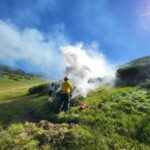 „Jedes Feuer fängt klein an – ein kleines Feuer lässt sich noch mit den einfachsten Mitteln bekämpfen, man muss nur wissen wie es geht“, erklärte Lindon Pronto vom „Europäischen Forst Institut” (efi) in Bonn auf der Oberkaser-Alm droben am Geigelstein den Männern und Frauen von den benachbarten Almen, den Männern der Bergwacht und den Führungskräften der Feuerwehr.