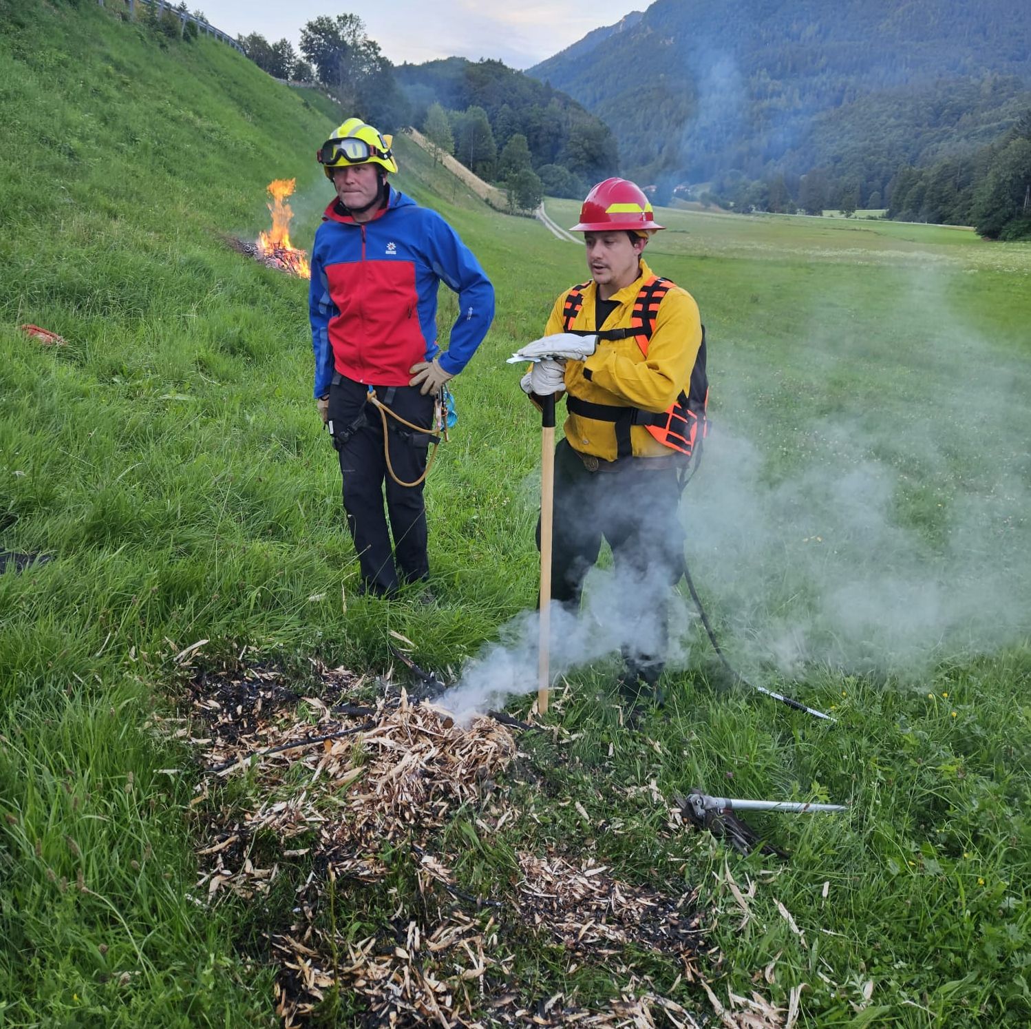 „So bekämpft man ein kleines Feuer erfolgversprechend“ Lindon Pronto vom „Europäischen Forst Institut” (efi) in Bonn (rechts) und Jörg Häusler der Landesbeauftragte für den Katastrophenschutz der Bergwacht Bayern (links)