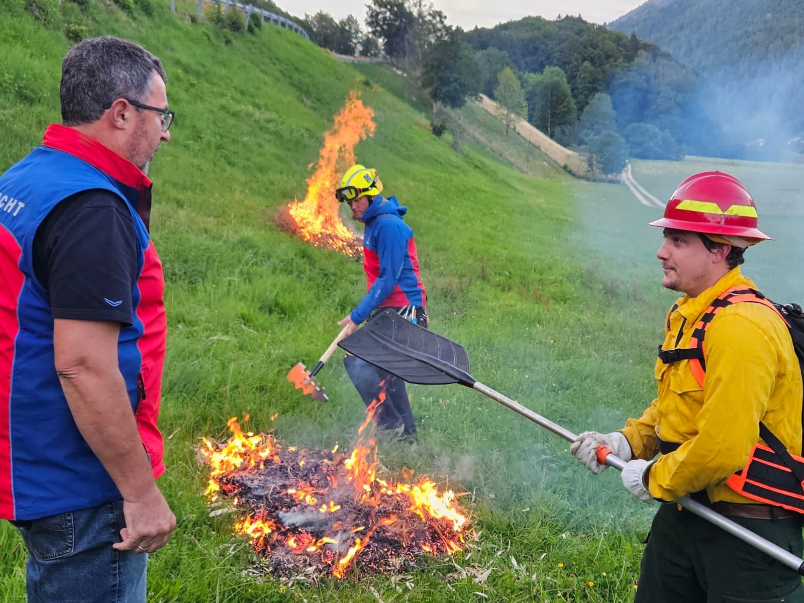 „So bekämpft man ein kleines Feuer erfolgversprechend“ Lindon Pronto vom „Europäischen Forst Institut” (efi) in Bonn (rechts), Jörg Häusler der Landesbeauftragte für den Katastrophenschutz der Bergwacht Bayern (Mitte) und Wast Pertl Bergbauer in Sachrang (links)