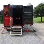 Dominik Mauer aus Schweinfurt ist einer der Ausbilder, die den Container auf seinem Weg durch den Freistaat begleiten, jeden Tag ist er mehrfach unter Atemschutz zur Ausbildung im Container und bringt den Lehrgangsteilnehmern das richtige Verhalten im und am Feuer bei. Er ist auch im Hauptberuf Feuerwehrmann bei einer großen Firma in Schweinfurt und hat durch viele Lehrgänge die Lehrerlaubnis für diesen Container erworben. „Unser Hauptziel ist es stets, die jungen Feuerwehrleute an das Feuer heranzuführen und ihnen Vertrauen zu ihrer Schutzausrüstung zu geben. Die Gemeinden haben große Summen in die Brandschutzanzüge der Feuerwehren investiert, die Aktiven sollen sehen, dass sie durch diese Ausrüstung auch tatsächlich geschützt sind. Sie sollen erkennen, dass die körperliche Belastung in einem heißen, verqualmten und dunklen Raum extrem hoch ist und nur ständiges Fühlung halten und eingespielte Handlungen im Team zum Erfolg führen können. Echte ganz große Brandeinsätze stellen heute eher die Ausnahme im Einsatzspektrum der Feuerwehren vor Ort dar, umso wichtiger ist es, dass alle das Wesen des Feuers kennen. Zimmerbrände gehören auch heute noch zum alltäglichen Geschäft auch der kleinen Wehren, gerade diese Art von Bränden versuchen wir im Container zu simulieren. Wir wollen den eingesetzten Kräften zeigen, wie ein Feuer brennt, welche Auswirkungen der Rauch hat und wie sie ihr Material am besten zum Einsatz bringen können. Dabei versuchen wir die spektakulären Bilder aus dem Fernsehen, mit ihren Explosionen und Verpuffungen aus den Köpfen der Lehrgangsteilnehmer zu bringen. Als Ziel am Rande versuchen wir zu vermitteln, dass es bereits mit geringen Mengen an Löschmitteln möglich ist einen Brand wirksam zu bekämpfen und die Effektivität des Einsatzes nicht an der Menge des verbrauchten Wassers gemessen wird“.