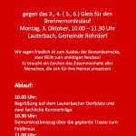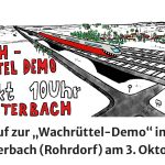 Zu einer “Wachrüttel-Demo” gegen die Neubau-Pläne für den Brennernordzulauf wird am Tag der Deutschen Einheit, 3. Oktober, in Lauterbach in der Gemeinde Rohrdorf aufgerufen. Die Demonsration geht von 10 bis 11.30 Uhr und hat folgenden Ablauf: