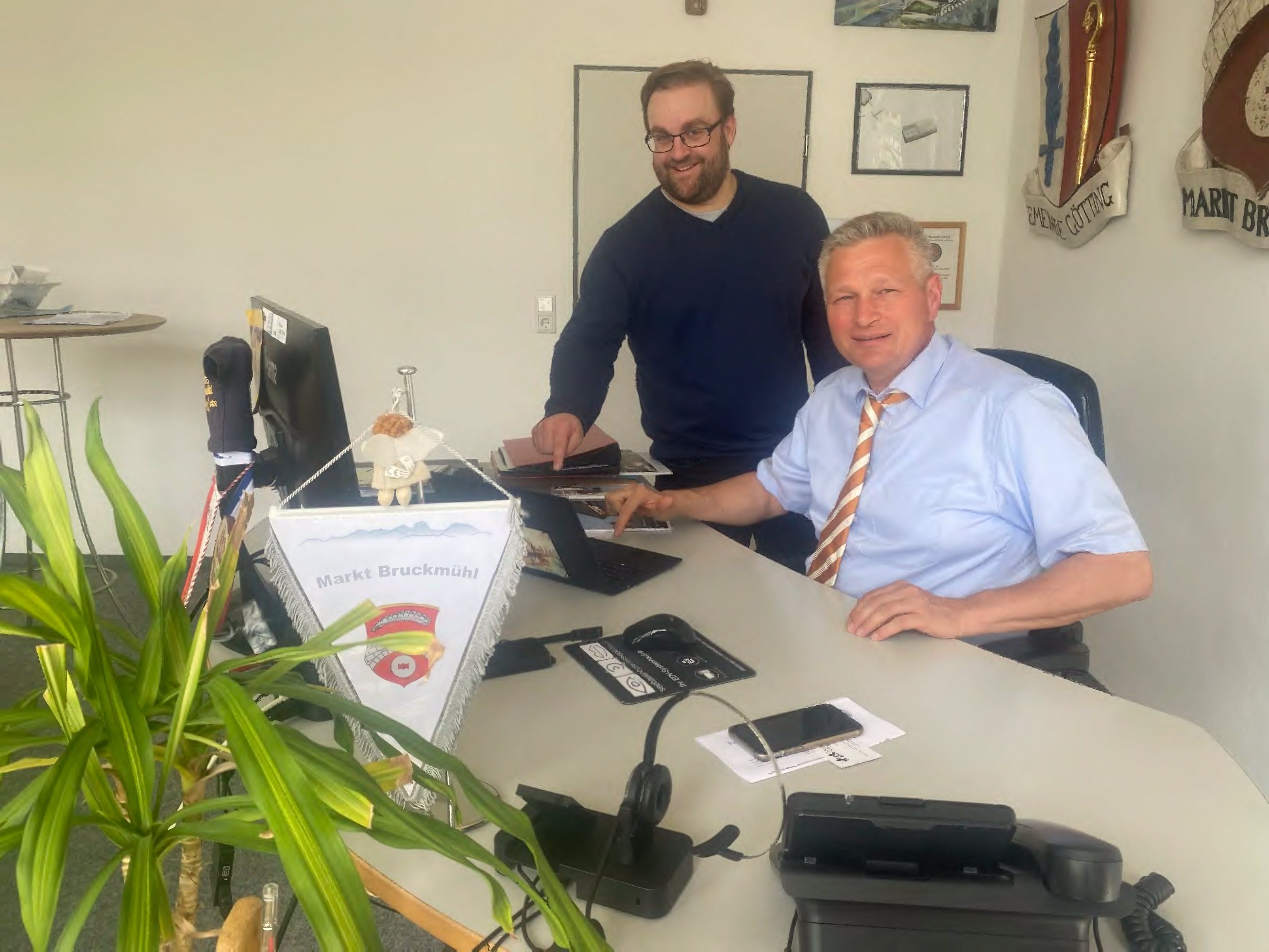 Bruckmühls Bürgermeister Richard Richter (rechts) und Jugendreferent Christian kastl geben per Mausklick den digitalen Startschuss fürs Ferienprogramm. Ab sofort stehen Angebote online, werden stetig ergänzt und Anmeldungen sind möglich. Foto Mischi