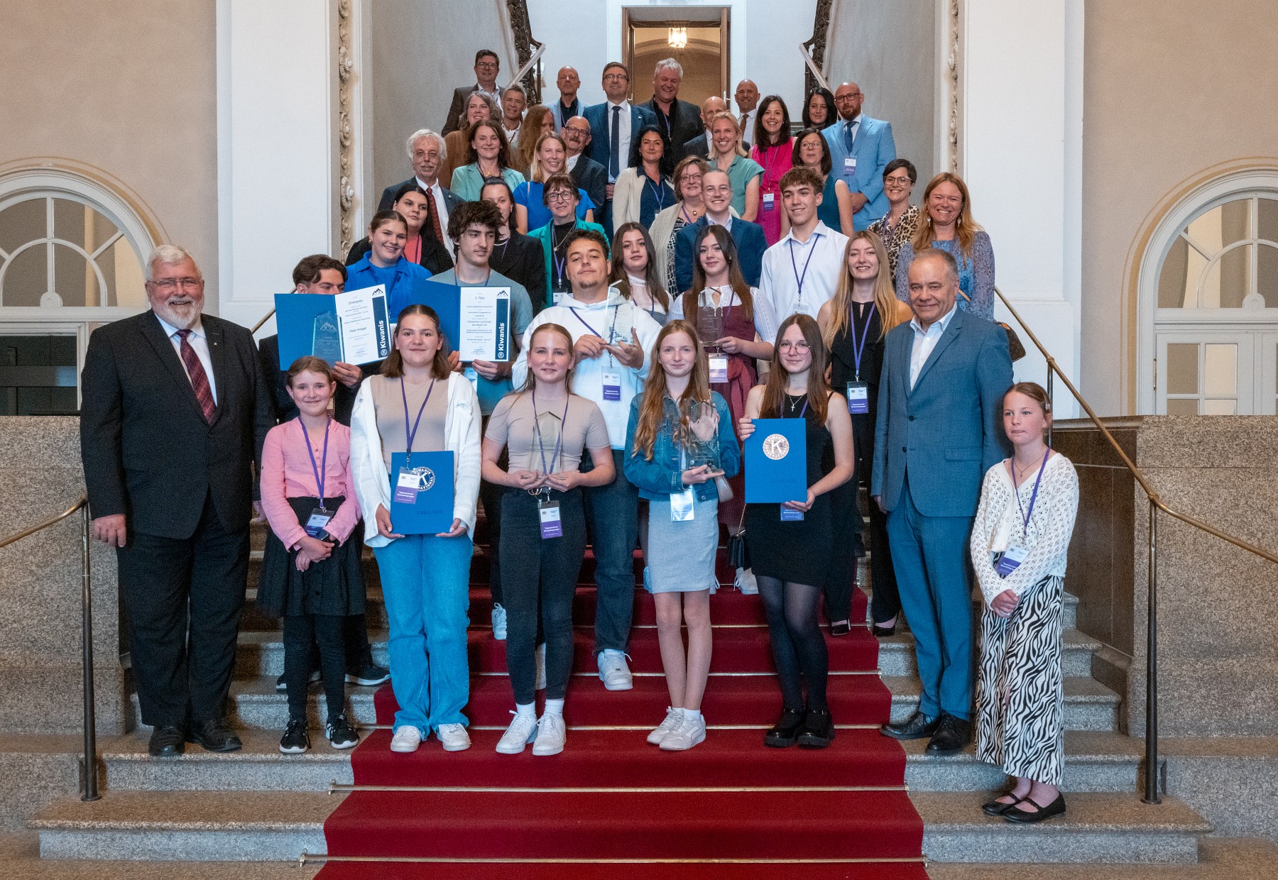 Alle Preisträgerinnen und Preisträger mit Eltern, Lehrerinnen, Trainerinnen und Trainer auf der Treppe in der Friedrich-Bürklein-Halle im Bayerischen Landtag