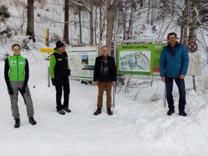 Carmen Neumann Gebietsbetreuerin der Rosenheimer Alpen, Franz Knarr DAV Sektion Rosenheim, Dr. Georg Kasberger Behördenleiter des Amtes für Ernährung, Landwirtschaft und Forsten Rosenheim und Christoph Schnurr Leiter der Geschäftsstelle der Alpenvereins-sektion Rosenheim zusammen vor der naturverträglichen Skitourenkarte am Auerbachwan-derparkplatz in Oberaudorf.