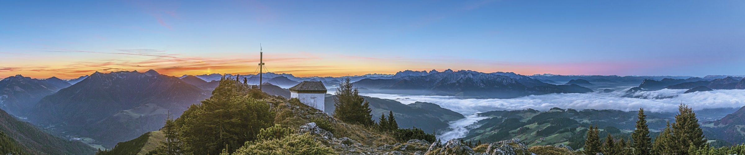 Der Tag erwacht – die ersten Sonnenstrahlen berühren das Gipfelkreuz und die kleine Kapelle auf dem Spitzsteingipfel, während das Inntal tief unter den Wolken liegt. Hier direkt auf dem felsigen Gipfel, finden im Sommer und Herbst häufig Bergmessen statt.