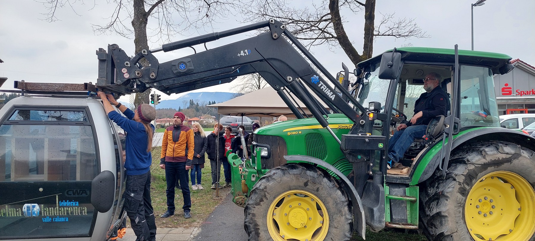 Die Eröffnung begann spektakulär: Gemeinderat Josef Höß brachte die Gondel mit seinem großen Traktor und stellte sie auf abschüssigem Gelände Zentimeter-genau auf die vom Bauhof Rohrdorf vorbereitete Fläche. Während Rohrdorfs Bürgermeister Simon Hausstetter die Anwesenden – insbesondere die die Gondel betreuende Rohrdorfer Bürgerin – begrüßte und den Werdegang der Gondel erläuterte, entfernten die Schüler die Transportsicherungen. Karl Garawenta jun. freute sich, dass beide von der Firma zur Verfügung gestellten Gondeln so eine schöne Verwendung finden. Denn die Wurzeln des namhaften Rohrdorfer Bauträgers lagen im Seilbahngeschäft. Die Schulleitung der Montessori-Schule, Irina Huber-Dick, bedankte sich beim Pädagogen Max Hausmann und seinen Schüler*innen aus der Projektstufe für die tolle Arbeit.