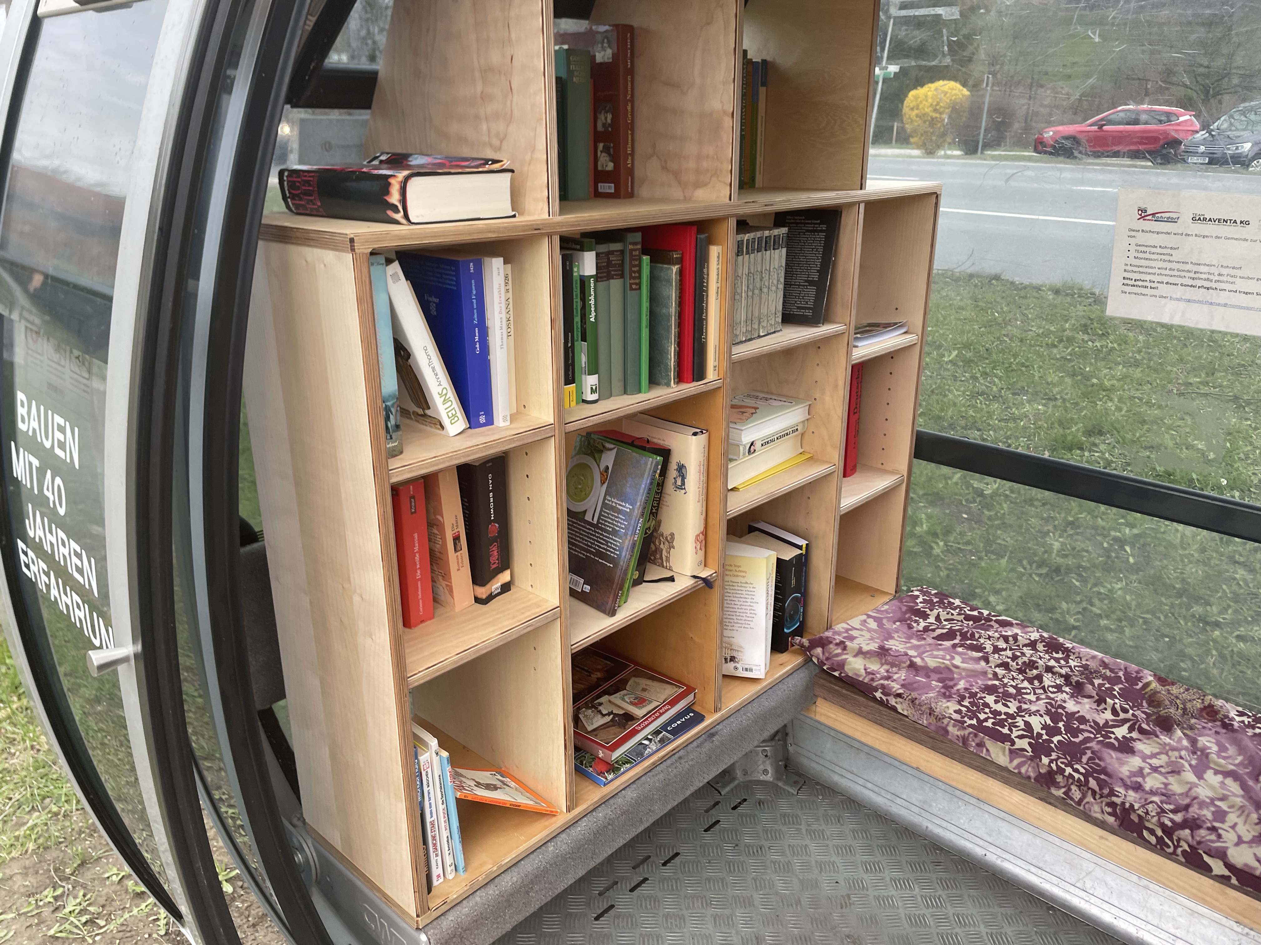 Rohrdorf hat seit dem 24. März in Thansau eine zweite Büchergondel. Die erste steht seit mehr als 4 Jahren vor dem Schulhaus der Montessorischule am Dorfplatz in Rohrdorf. Da die Fa. Team Garawenta / Rohrdorf noch eine zweite Gondel zur Verfügung stellte und eine Thansauer Bürgerin sich zur ehrenamtlichen Betreuung der Gondel bereiterklärte, gingen die Gemeinde Rohrdorf und der Montessori-Förderverein das Projekt an. Die Montessori-Schüler*innen der 7./8. Jahrgangsstufe übernahmen den Innenausbau. Nach dem Vorbild der ersten Gondel wurden Fächer für ca. 300 Bücher geschaffen und auch eine kleine, gepolsterte Sitzbank eingebaut.