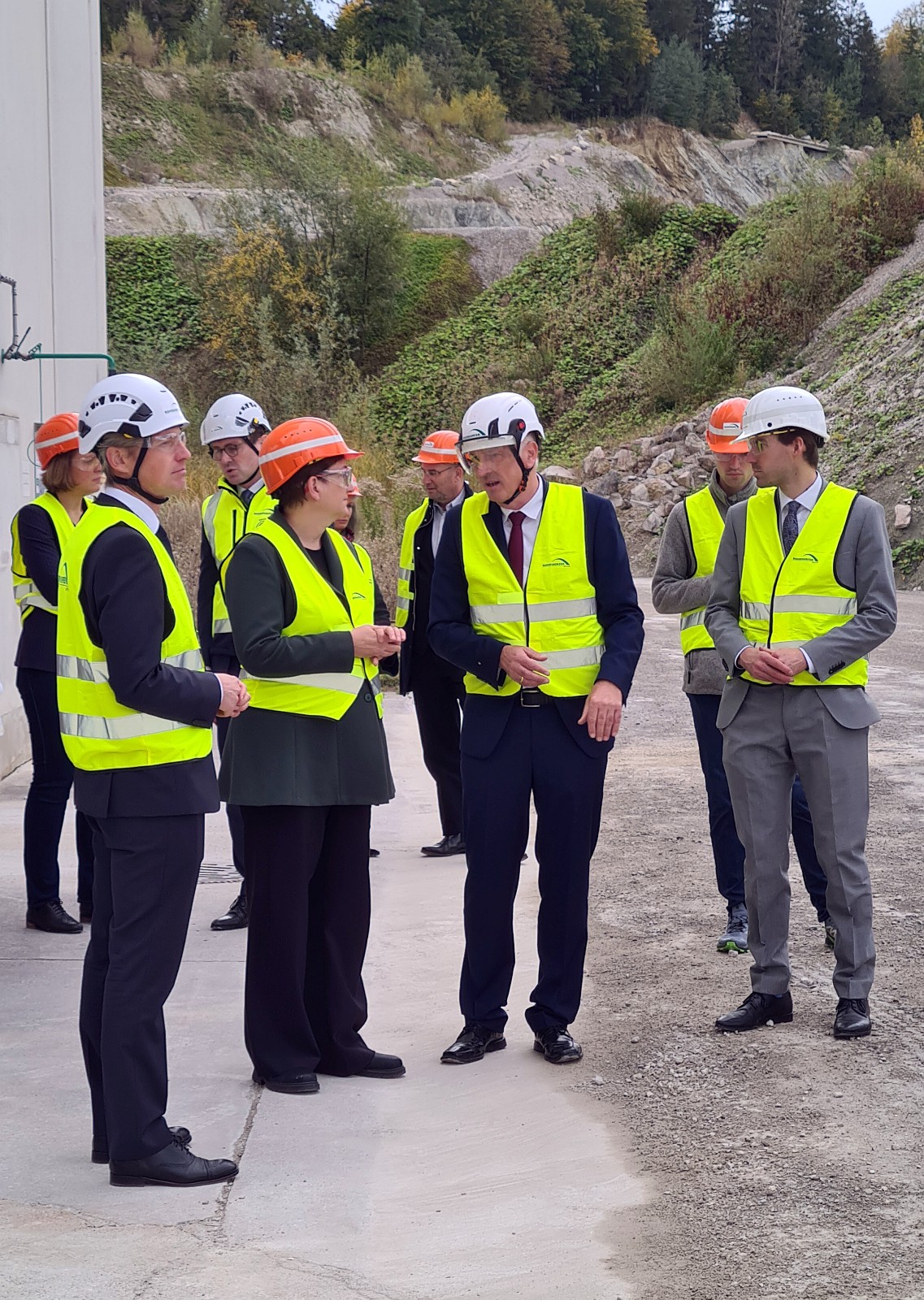 1. Reihe v.l.n.r.: Dr. Christopher Ehrenberg, technischer Leiter Rohrdorfer Zementsparte, Bundesministerin Klara Geywitz, Rohrdorfer Geschäftsführer Mike Edelmann und Simon Hausstetter, 1. Bürgermeister der Gemeinde Rohrdorf.