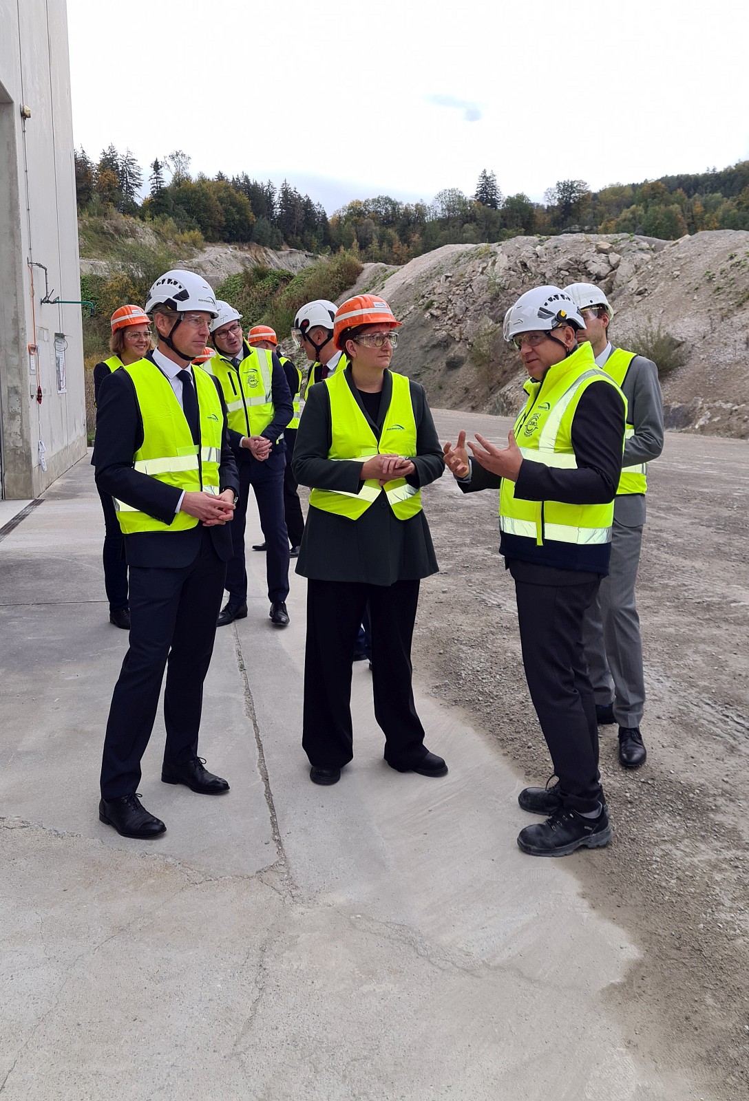 Dr. Philipp Stadler (rechts) vom Rohrdorfer Net Zero Emission-Team erklärt Frau Geywitz (Mitte) die Funktionsweise der CO₂-Rückgewinnungsanlage.