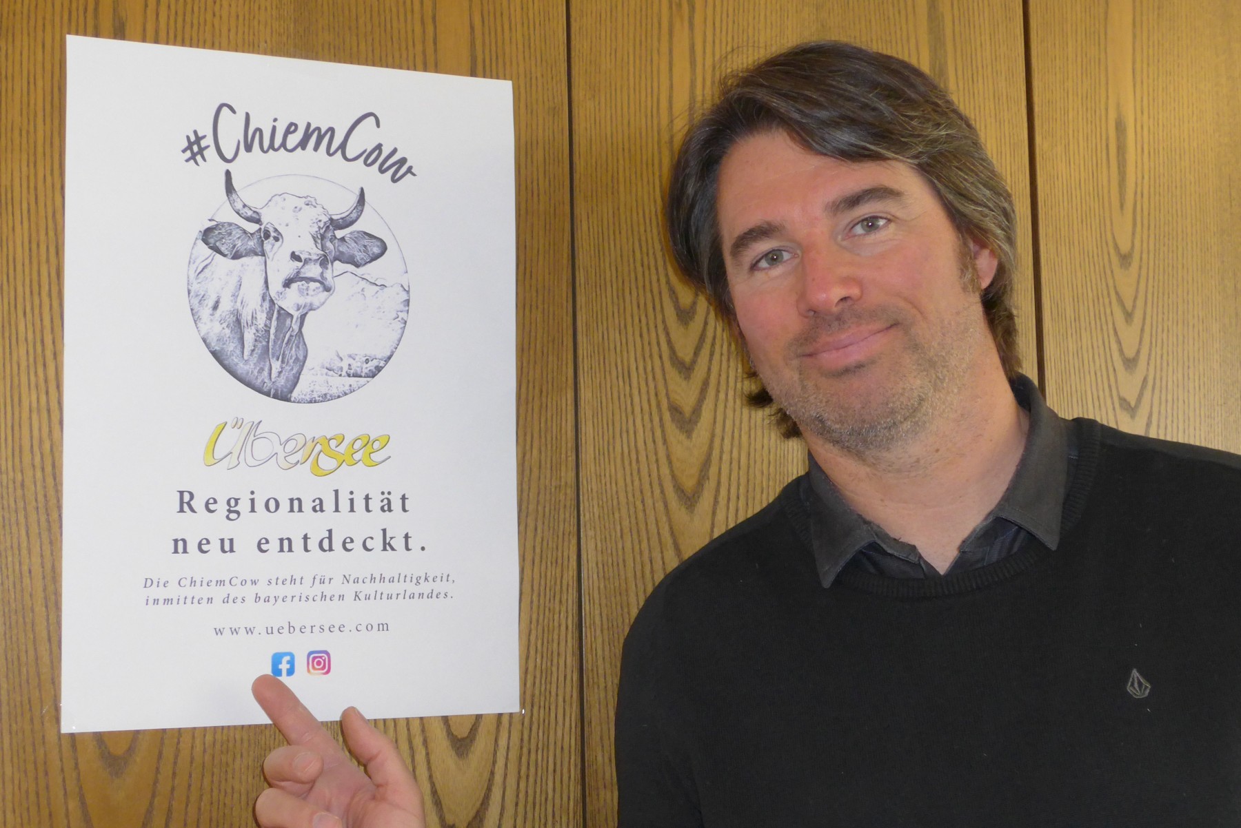 Tourist-Infoleiter Mike Wielandner präsentiert das Logo „ChiemCow“.