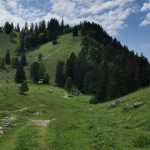 Hier weist auch ein Schild nach links auf den Weg zur Brachtalm. Dieses beachten wir jedoch nicht, die Strecke ist den Wanderern vorbehalten. Wir fahren hier also geradeaus weiter und verlassen die Forststraße 600 m danach. Hier beginnt die kurze, aber nicht einfache Auffahrt zur Brachtalm. Doch bald haben wir den holprigen Weg überwunden, es wird flacher und kurz nachdem der Wanderweg von links einmündet, sehen wir schon die Brachtalm vor uns liegen. Der Ausblick ist zwar nicht phänomenal, aber die felsigen Nordabstürze des Hochgern und das Silleck sind sichtbar. Aber das stört nicht, denn die freundlichen Wirtsleute verwöhnen uns mit kühlen Getränken und schmackhaften Almspeisen.