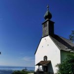Von der Brachtalm fahren wir ca. 200 Meter zurück. Hier, wo von rechts der Fußweg von der Vorderalm einmündet, verlassen wir den Wirtschaftsweg nach links. Wir müssen kurz unser Rad über einen Weidezaun heben (ggf. später noch einmal), queren ein Bachbett und fahren dann auf einem schmalen Singeltrail durch lichten Wald. Bei einer Wiese wird der Weg wieder besser befahrbar, und bald sehen wir etwas entfernt die Staudacher Alm vor uns liegen, unsere dritte Einkehrmöglichkeit. Hinter der urigen Alm führt eine Forststraße nach Norden in den Wald hinein. Diese fahren wir für die nächsten 500 Meter. Dann, nach einer Linkskurve, erreichen wir einige Wegweiser. Unser Weg führt nach links (“Wegweiser Schnappenkirche 30 Minuten”). Der Waldweg ist offiziell für Mountainbikes zugelassen, aber aufgrund der vielen Wurzeln und Steine trotzdem nicht leicht. Gelegentlich müssen wir unser Rad kurz schieben, besonders kurz vor der barocken Schnappenkirche. Doch bald sehen wir schon den Kirchturm vor uns. Dahinter reicht der freie Blick ins Alpenvorland und mit dem Chiemsee, Grassau und zur Kampenwand. Eine Aussichtsbank vor der Kirche lädt zu einer Ruhe- und Fotopause ein.