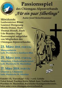Der Chiemgau-Alpenverband inszeniert zum zweiten Mal das Passionsspiel „Für ein paar Silberlinge“ von dem Autor Sepp Kriechhammer. Nach dem großen Erfolg vor zwei Jahren wird es diesmal sogar drei Aufführungen in der Fastenzeit geben, das sind: