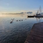 Zum Tagesanfang kann man am Chiemsee oft tolle Stimmungen erleben, wie die vor ein paar Tagen entstandenen Aufnahmen des früh aufgestandenen Fotografen zeigen. Auch die Schwanenfamilie genießt die Ruhe vor dem Ansturm der Badegäste.