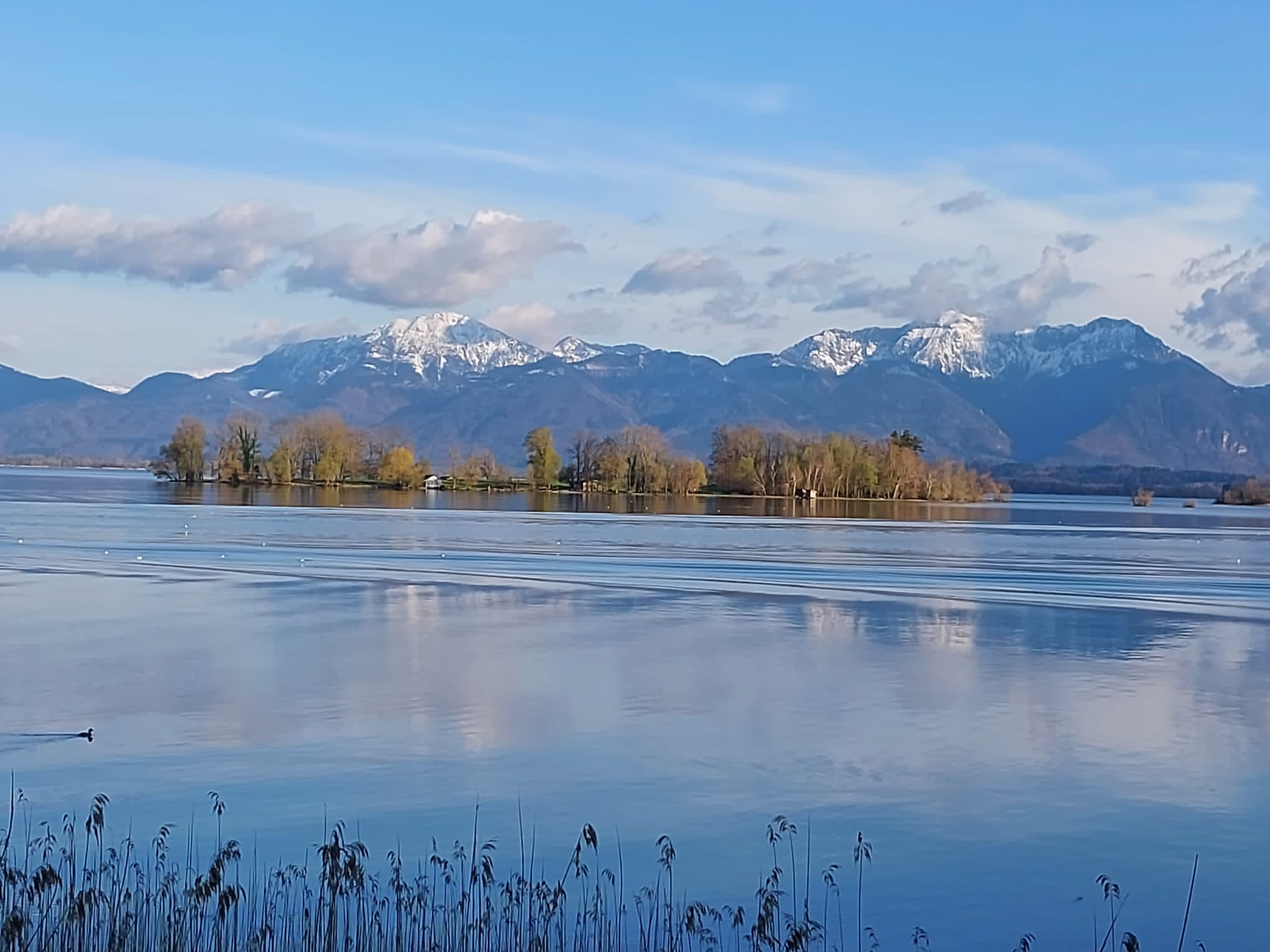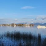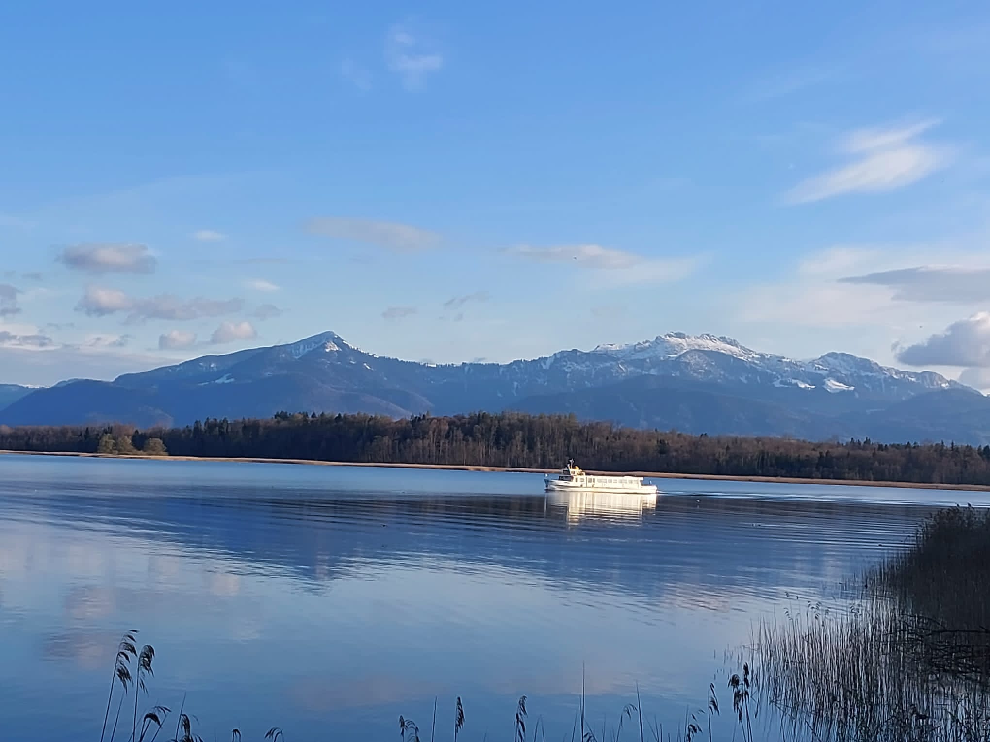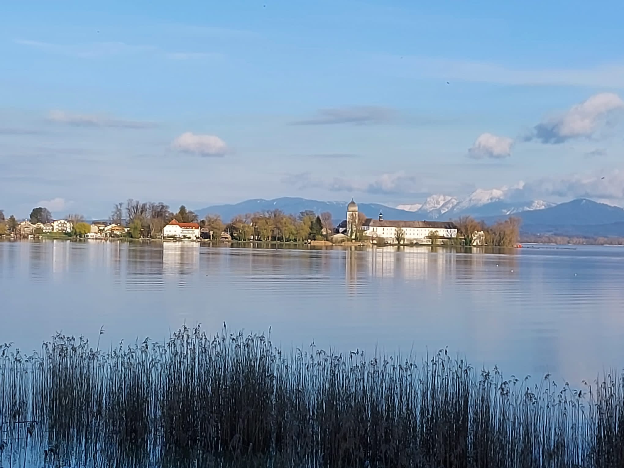 Klare Farben, noch wenig Betrieb auf dem Wasser des Bayerischen Meeres und die Fraueninsel im Abendlicht kennzeichnen diese Aufnahmen vom Dienstagabend.