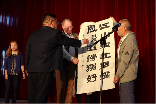 Bürgermeister Yuan Xiangsheng (1.v.l) überreicht 2019 bei der 30 Jahr Feier dem Ehrenbürger von NZL Holger Magel eine Kalligraphie mit Gedichten von Mao (!) über die Schönheit chinesischer Landschaften