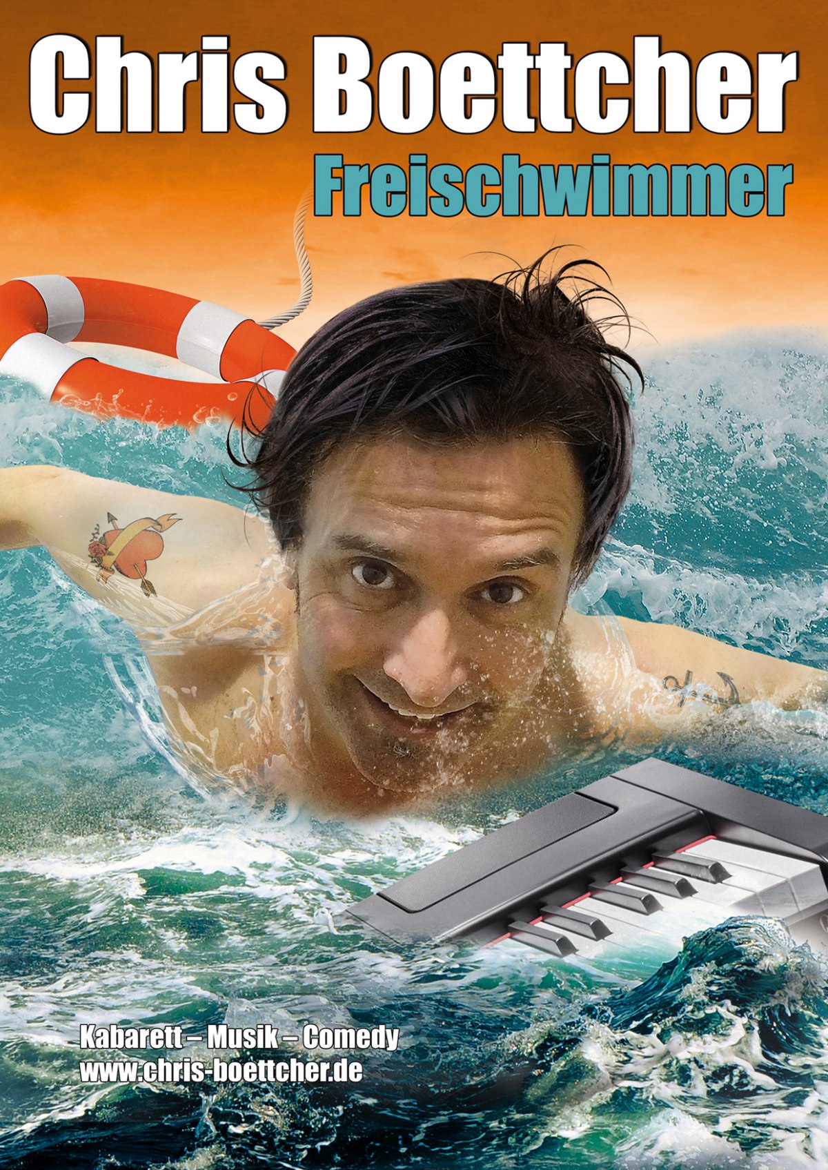 Schon als wir noch Spermien waren, ging es einzig darum der Allererste zu sein. Doch kaum raus im echten Leben geht das Wettstrampeln so richtig los! Nur wer sich über Wasser hält, gewinnt. Und immer schön die Baderegeln beachten und auf die Anweisungen des Bademeisters hören! Denkste. Chris Boettcher schert aus im stromlinienförmigen Wasserballett. Seine Parodien und Comedy-Songs sind die Arschbombe beim Seniorenschwimmen, die Haifischflosse im Kinderbecken! Überraschend und bayerisch-frech, unglaublich vielseitig und musikalisch! Der bayerische Radio-Kult-Komiker (Lothar & Franz, Fränglisch mit Loddar) und Comedy-Hit-Produzent (10 Meter geh, In der Pubertät, Bonjour la France) mit seinem neuen Live-Programm FREISCHWIMMER ab März 2018 auf Tour.