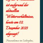 Hierzu teilt die Prien Marketing GmbH am mittag mit: Wir müssen heute 02.12.2023 den Christkindlmarkt auf der Fraueninsel aufgrund der Wetterlage absagen. Das Konzert von Wolfgang Binder und die Konzerte auf der Außenbühne sind abgesagt. Bezüglich der Konzertkarten für Wolfgang Binder werden wir uns in der kommenden Woche mit unseren Kunden in Verbindung setzten.