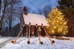Beim Glentleitner Christkindlmarkt herrscht eine ganz besondere Atmosphäre, nicht zuletzt durch die stimmungsvolle Adventsmusik wie hier von den Rieder Alphornbläsern. Bildquelle: Bezirk Oberbayern, Archiv FLM Glentleiten, Foto: Bäck.
