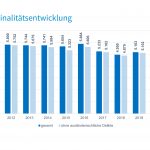 Corona-Lockdown und Kontaktbeschränkungen haben auch eine positive Seite: Im Jahr 2020 wurden in der Stadt Rosenheim insgesamt nur noch 4.211 Straftaten (2019: 5.163) in der Polizeilichen Kriminalstatistik erfasst. Im Vergleich zum Vorjahr bedeutet dies einen Rückgang von 952 Straftaten bzw. 18,4 Prozent. Diese Zahlen gab Polizeipräsident Robert Kopp beim alljährlichen Sicherheitsgespräch von Polizeipräsidium und Stadt Rosenheim am Donnerstag, 08.04.2021, bekannt.