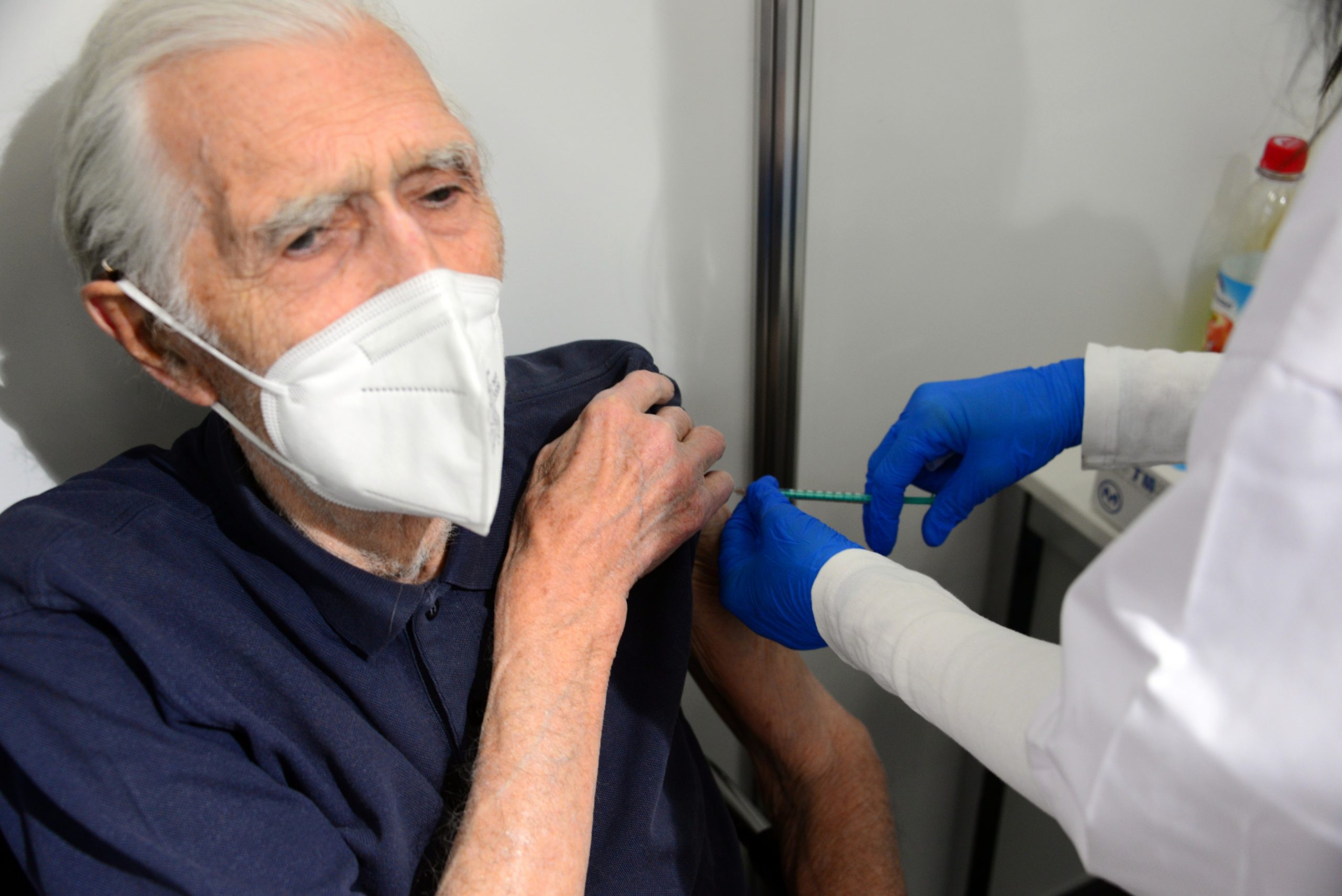 Karl Stankiewicz bekommt Covid-Impfung im Messegelände, Halle C3, Corona Pandemie, in München, Deutschland