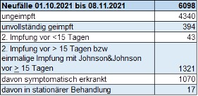 Tabelle: Neufälle an COVID-19 im Zeitraum 01.10. – 08.11.2021 nach Impfstatus