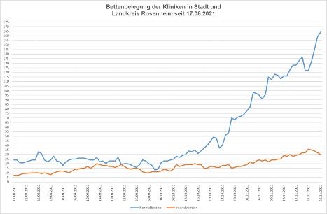 194 (am 18.11.2021: 165) COVID-19-Patienten werden aktuell in Stadt und Landkreis Rosenheim stationär behandelt. Hiervon befinden sich 30 Patienten (am 18.11.2021: 30) auf einer Intensivstation.